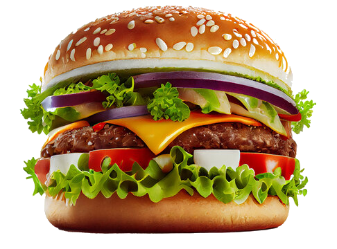 mit Salat, 1x Rindfleisch-Patty, 1x Chicken-Patty , 2x cheddar, Tomaten, Gewürzgurken, karamellisierte Zwiebeln und 2x Burgersauce